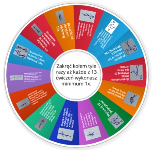 Drodzy rodzice i drodzy uczniowie! Przesyłam propozycję ćwiczeń w domu w formie ruletki. Można się przy tym dobrze bawić całą rodziną. Jeżeli ktoś ma ochotę może skorzystać z innych materiałó w interaktywnych, tj. „Losowe Karty”; „Otwórz okno”. Życzę miłej zabawy i determinacji w dążeniu do ukończenia zadań. Karina Trzebińska- Koczorowska