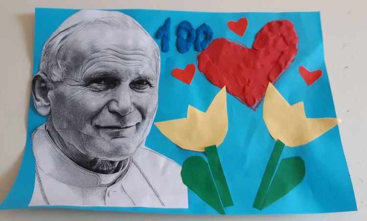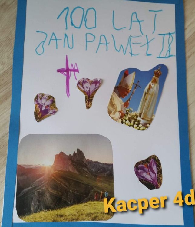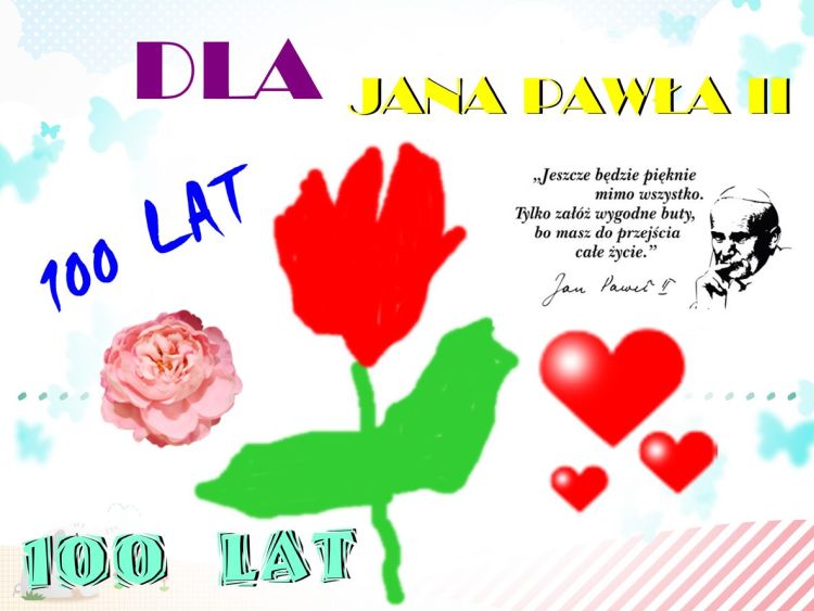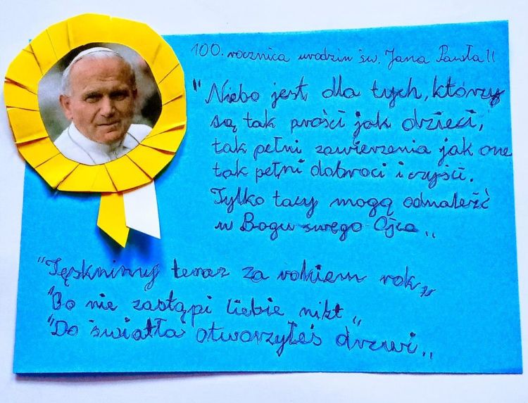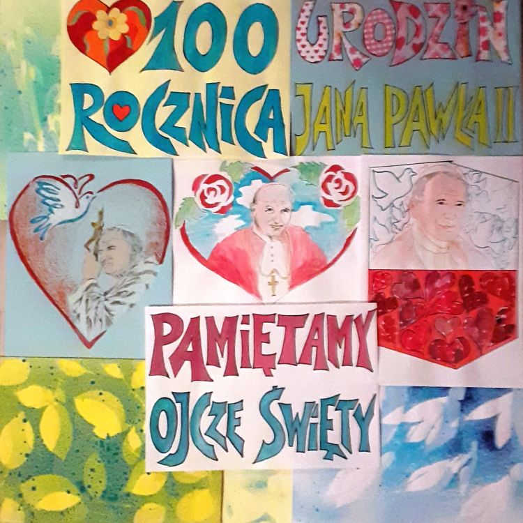 Dzisiejszy dzień, setna rocznica urodzin Świętego Jana Pawła II, świętowana jest w całej Polsce. Nasza społeczność szkolna włączyła się w również w jej obchody. Prezentuję plon dwóch konkursów.