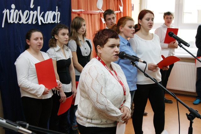 24 listopada zaprosiliśmy całą społeczność uczniowską naszego Ośrodka na spotkanie z piesnią patriotyczną. Przypomnieliśmy pieśni i piosenki patriotyczne, które towarzyszyły narodowi polskiemu w ważnych wydarzeniach dziejowych, w wykonaniu uczniów wszystkich etapów edukacyjnych - od klasy drugiej szkoły podstawowej aż do klas szkoły przysposabiającej do pracy. Ich piękna prezentacja, słów i melodii, pieśni patriotycznych cieszyła się wielkim zainteresowaniem i aplauzem widowni. Uczestnicy uroczystości sami włączali się w jej tok, intonując fragmenty znanych pieśni. Spotkanie z pieśnią patriotyczną stało się dowodem naszej wspólnoty i tożsamości narodowej. Było to piękna, melodyczna opowieść o historii naszej Ojczyzny. Montaż słowno - muzyczny został przygotowany pod kierunkiem nauczycieli: p. Rity Kaczmarek, p. Małgorzaty Lubiszewskiej, p. Wojciecha Lewandowskiego i p. Łukasza Faca.