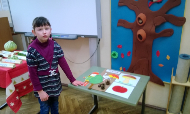 Uczniowie klas podstawowych wzięli udział w spotkaniu pt. „Jesień dookoła nas”. Pogłębili wiadomości o charakterystycznych cechach pory roku- Jesieni.Dokonywali obserwacji zmian zachodzących w przyrodzie w zależności od pory roku - wspólnie układali makietę Jesieni.Doskonalili umiejętność uważnego słuchania czytanego tekstu wiersza Jana Brzechwy „Na straganie”- poprzez czynny udział w inscenizacji wiersza.Poznawali warzywa wszystkimi zmysłami.