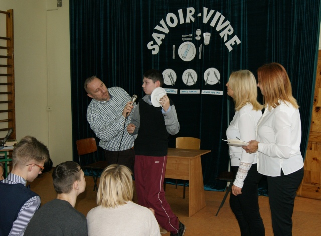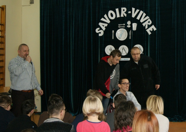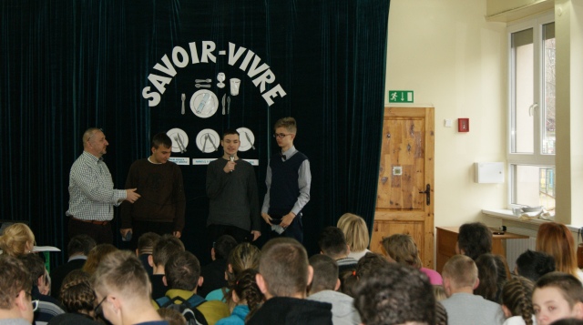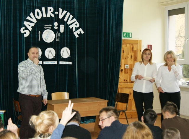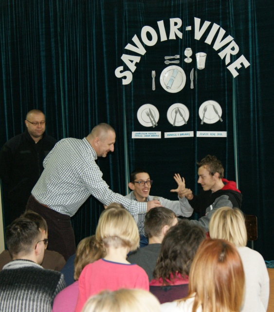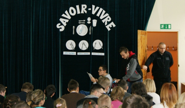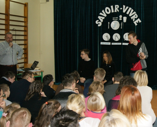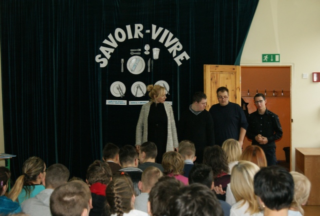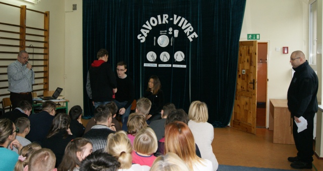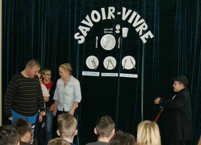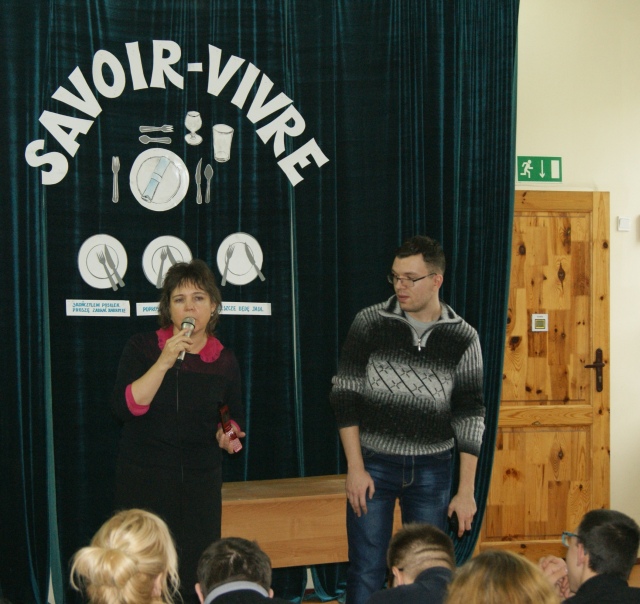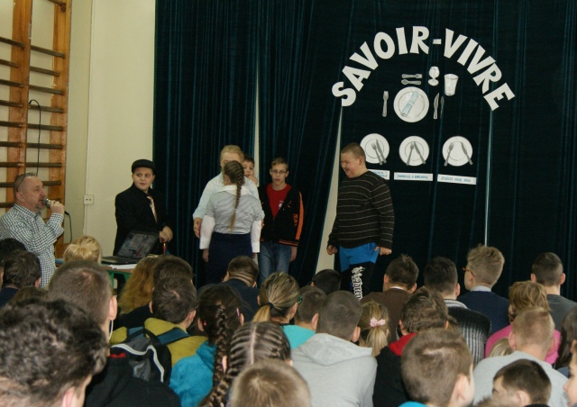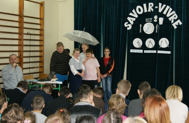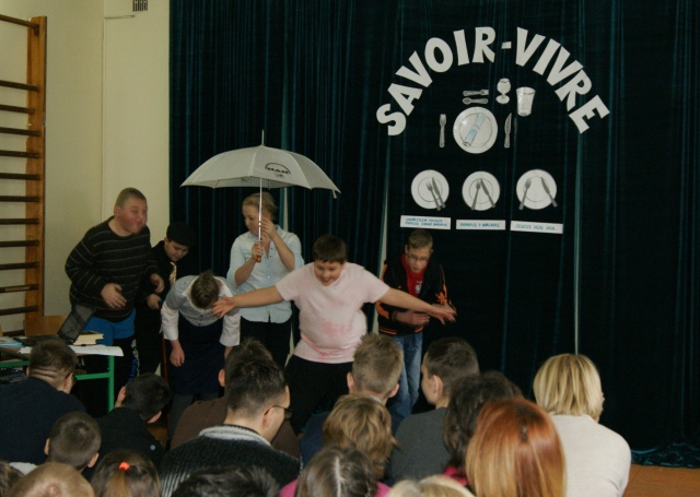 Dzisiejsze spotkanie poświęciliśmy sprawom dobrego wychowania. Uczniowie klas: 6b pani Anetty Szews; 1bg pani Anetty Jagłowskiej; 6c pani Iwony Pawłowskiej; 2bp pani Agnieszki Przekwasińskiej oraz 3cp pani Iwonu Ksieniewicz w bardzo sugestywny sposób przedstawili scenki pokazujące, jak należy zachować się w rożnych sytuacjach życiowych. Do naszego słownika dodaliśmy zwrot "savoir vivre", chociaż wielu z nas doskonale wie, co to dobre maniery. Uczniów pragnących pogłębić sprawy dobrego wychowania zachęcamy do odwiedzenia biblioteki i zapoznania się z książkami poświęconymi tym zagadnieniom.