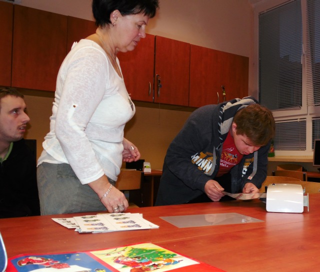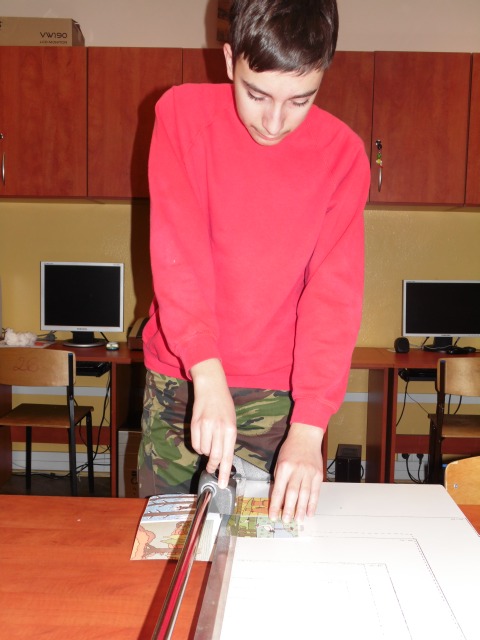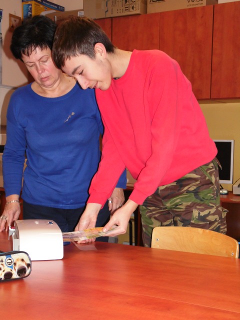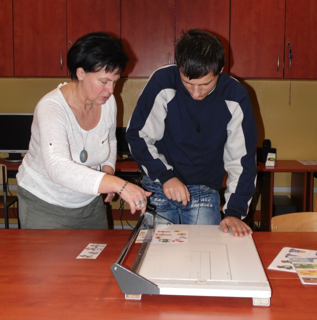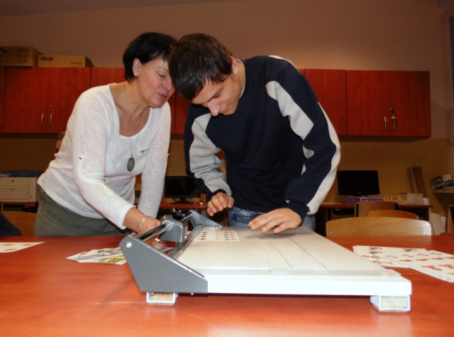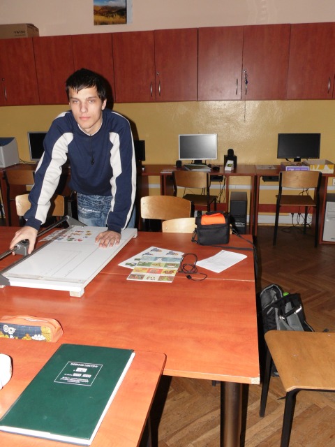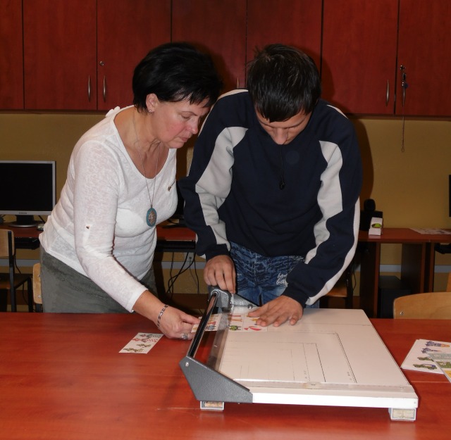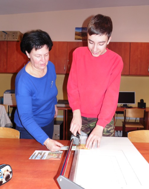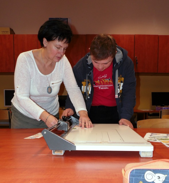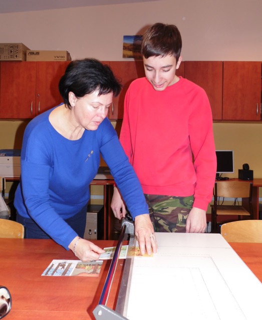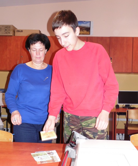 W pracowni tej uczniowie nabywają umiejętności, które mają przygotować uczniów do podejmowania pracy. Uczniowie uczą się bezpiecznie posługiwać narzędziami i urządzeniami charakterystycznymi dla tej pracowni tj. drukarka, ksero, laminarka, niszczarka dokumentów, bindownica i termobindownica. Poznają wielkości formatów papieru i ucza się docinać te formaty na nożu rolkowym, gilotynie. Uczą się jak naprawiać stare podręczniki i jak naprawione książki oprawiać. W pracowni poligraficzno inroligatorskiej uczniowie poznają proces produkcji papieru, jego zastosowanie, rodzaje papieru. Wykonują prace przestrzenne z tektury, okazjonalne kartki.