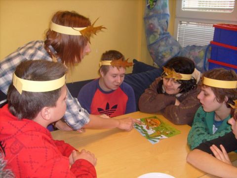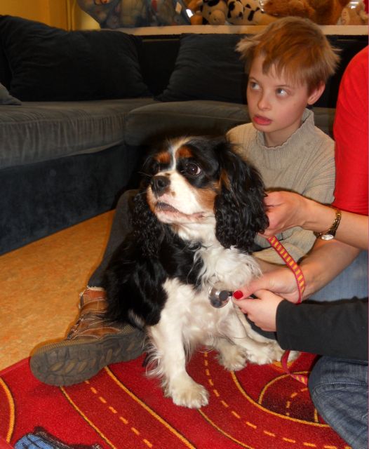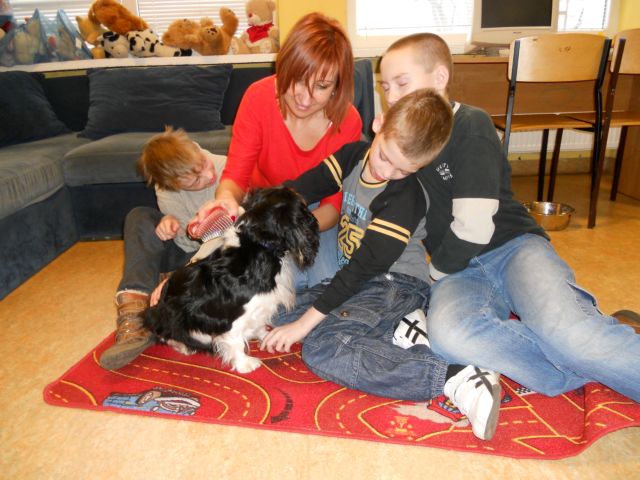 We wtorki zapraszamy do naszej świetlicy gości specjalnych: Julkę i Nukę wraz z opiekunem i terapeutą – P. Agnieszką Cypres. Zajęcia dogoterapii to najbardziej naturalny system ćwiczeń i zabaw z psami, wspomagający rehabilitację ruchową oraz umysłową dzieci i dorosłych z autyzmem, porażeniem mózgowym, upośledzeniem umysłowym, niedowładem kończyn itp. W trakcie zajęć wykonywane są ćwiczenia przez naśladowanie opiekuna i zwierząt. Dzieci i młodzież ćwiczą także rozumienie mowy poprzez wykonywanie instrukcji i wydawanie komend. Poza tym kształtowane są umiejętności społeczne, a także wyrabiana właściwa postawa wobec zwierząt.
