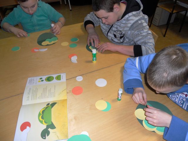Zajęcia origami prowadzone w świetlicy są celową formą usprawniania manualnego dzieci. Z kolorowych kół powstają np. latawce, ślimaki, żółwie, mrówki....Wykonywane przez dzieci prace poprzedzone są wierszem, piosenką czy zabawą ruchową. Niekwestionowanym walorem terapeutycznym origami jest radość tworzenia, odprężenie, koncentracja na działaniu i szybki efekt.