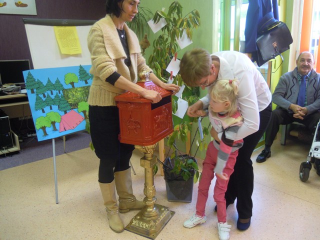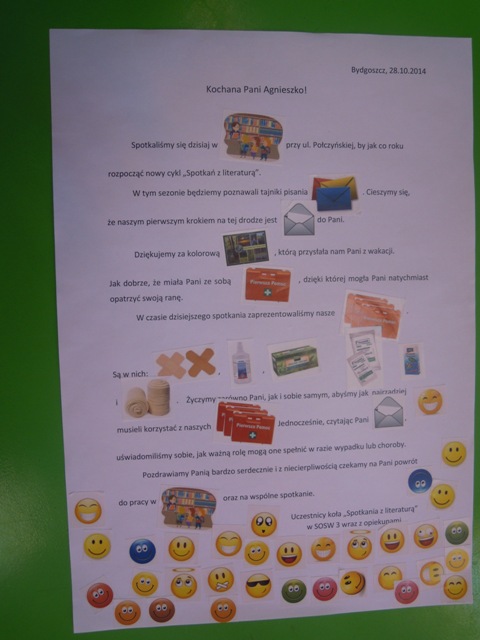 Idąc za przesłaniem „Nieś szczęście, nie zwlekaj” od razu przystąpiono do działania. Pierwszym listem, który został wspólnie napisany jeszcze w bibliotece, był list słowno – obrazkowy do Pani Agnieszki, w którym wszyscy uczestnicy podziękowali za miłe słowa i słali gorące pozdrowienia podpisując się pod nimi uśmiechniętymi buźkami. List, jak przystało, został zaadresowany i, z naklejonym znaczkiem, wrzucony do skrzynki pocztowej. Obiecaliśmy sobie także, że od teraz nie będzie już „listów, na które daremnie ktoś czeka, bo nikt ich nigdy nie chciał napisać.”