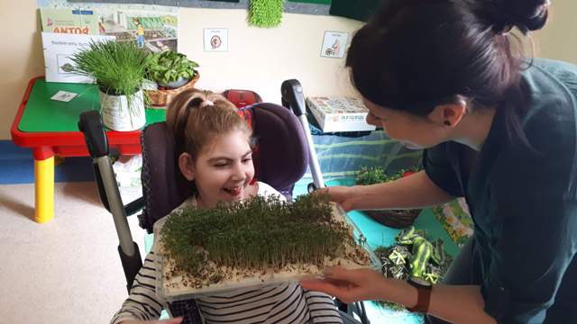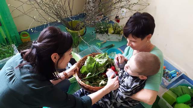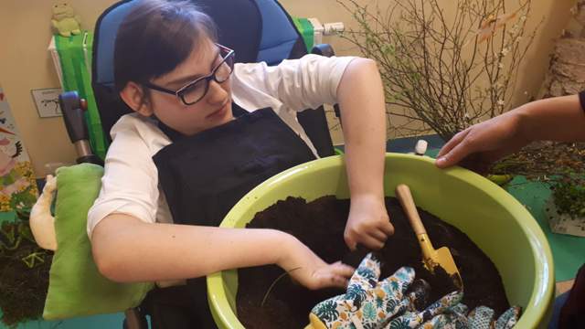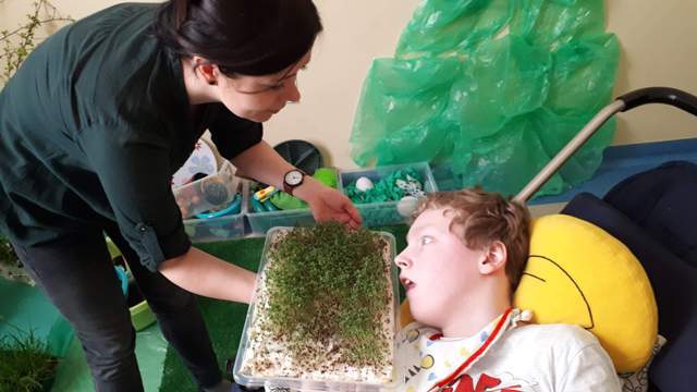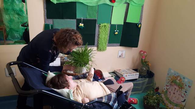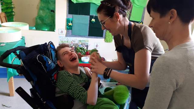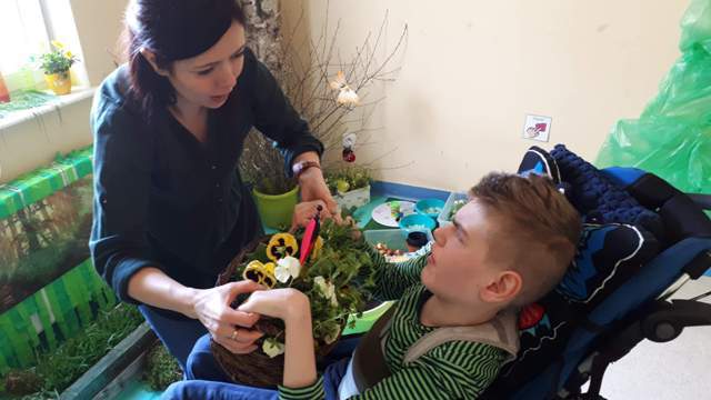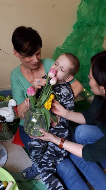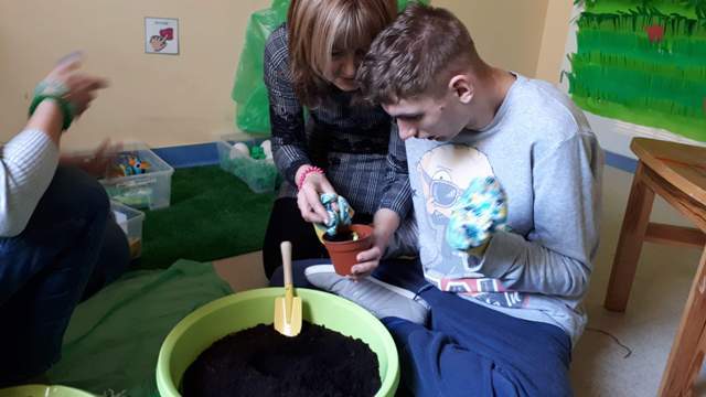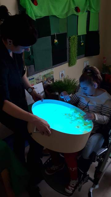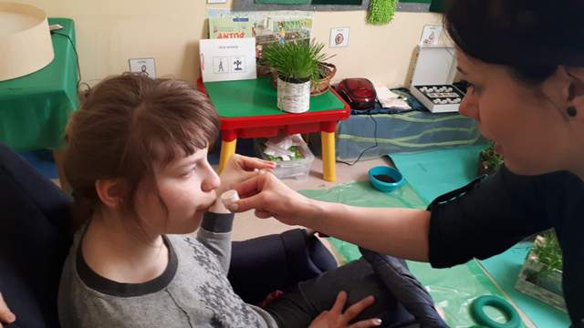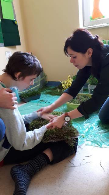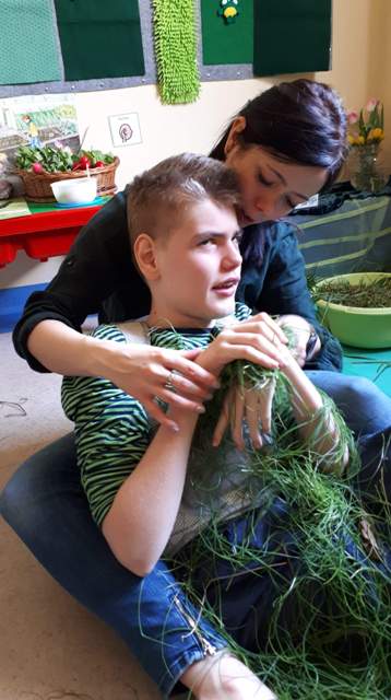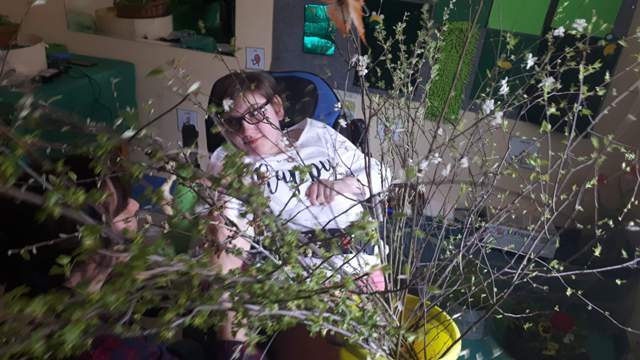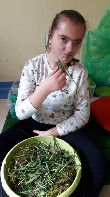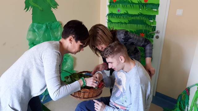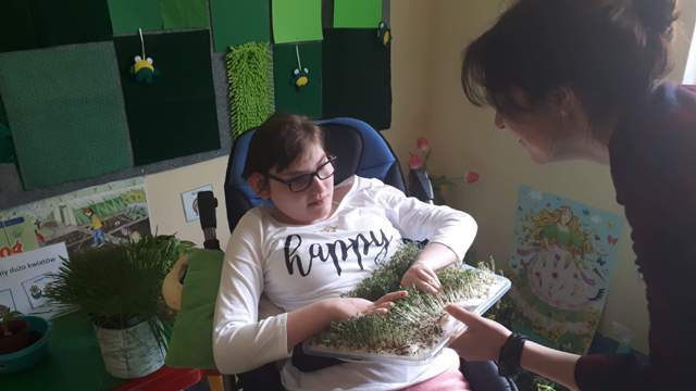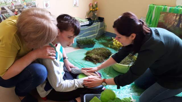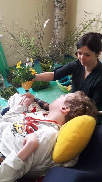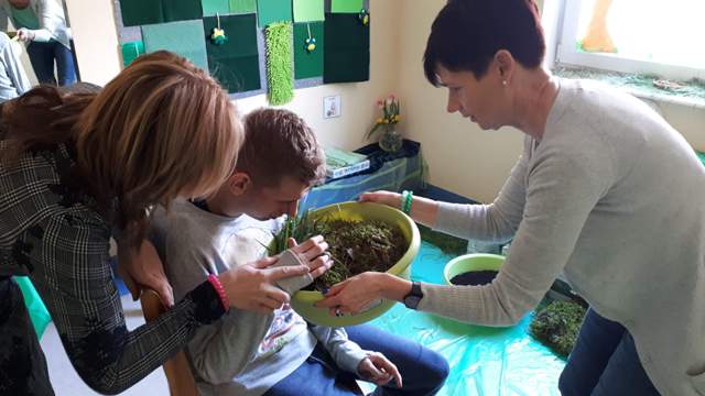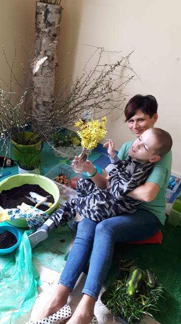 W marcu uczniowie nauczani indywidualnie w Ośrodku Wsparcia odwiedzali wiosenną salę sensoryczną. Zielono i pachnąco było już od progu - drzwi wejściowe zamieniły się w zielony trawnik, zapach młodych roślin wypełnił całą salę a pod sufitem falowały kwiaty i fruwały motyle. Gra świateł i naturalnego słońca podkreślała radosny nastrój tej pory roku. W świetlnej misie odwiedzający salę szukali koloru zielonego, wśród mchu kamieni fluorescencyjnych i zmieniających kolory podświetlanych jajek. Uczniowie zanurzali dłonie w ziemi, sadzili cebulę, poznawali zapach młodej trawy, szczypiorku i kwiatów. Podziwiali pąki i młode listki, a nawet kwiatki na gałązkach różnych krzewów. Mogli dotykać zielone przedmioty o różnych fakturach, słuchać odgłosów wiosennej przyrody, bocianów i żab. Wielozmysłowo poznawali wiosenne warzywa – rzodkiewkę, sałatę, rzeżuchę, szczypiorek. Nad wszystkim czuwała pani Wiosna w pięknej, strojnej i zielonej oczywiście sukience!