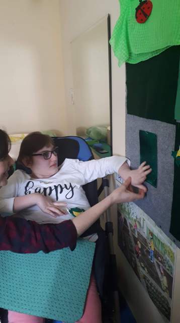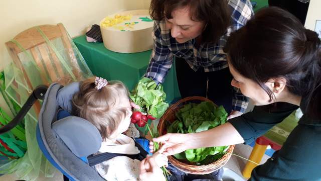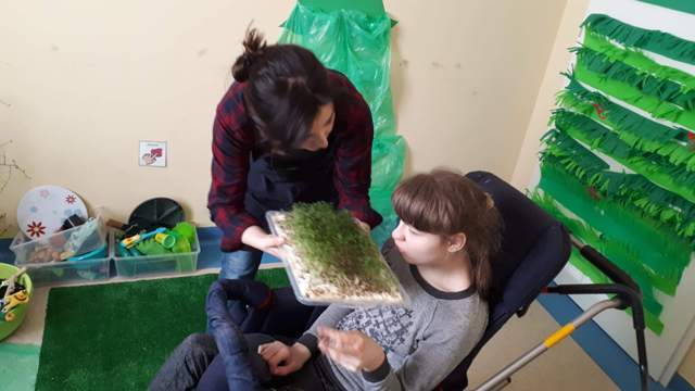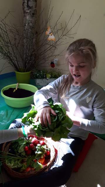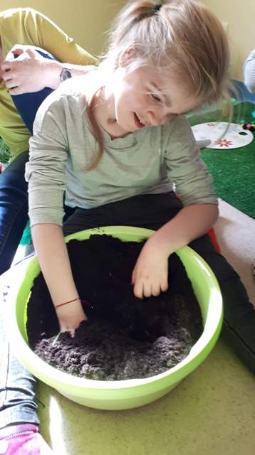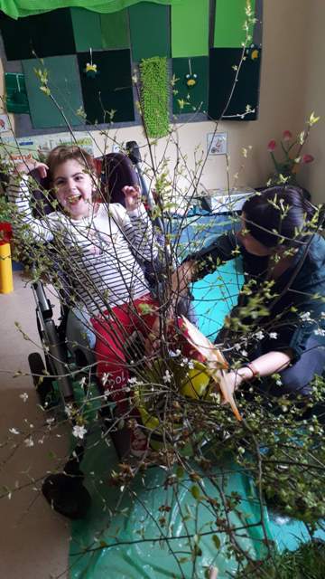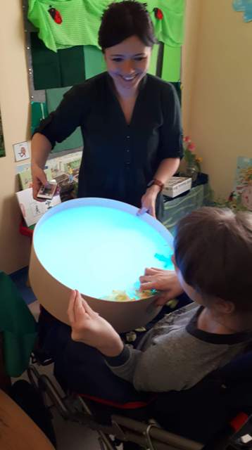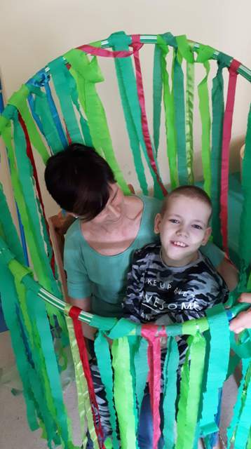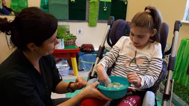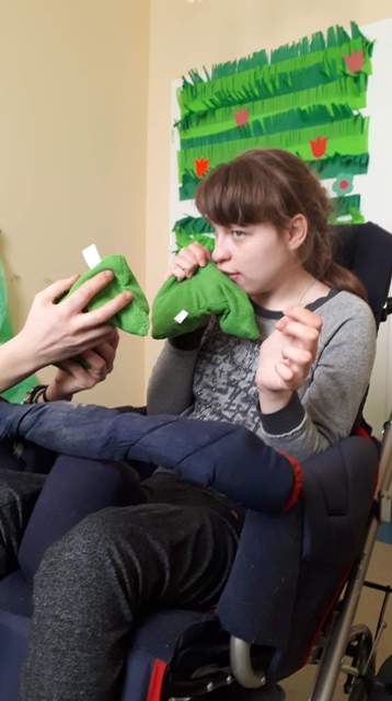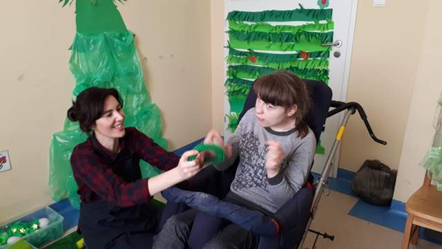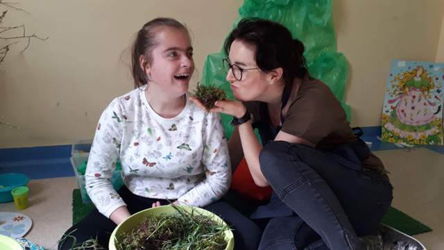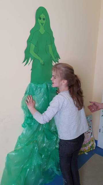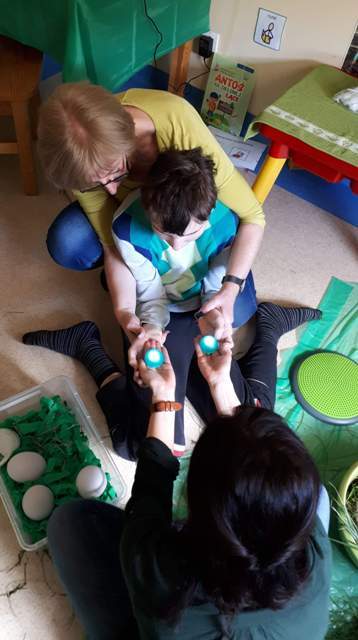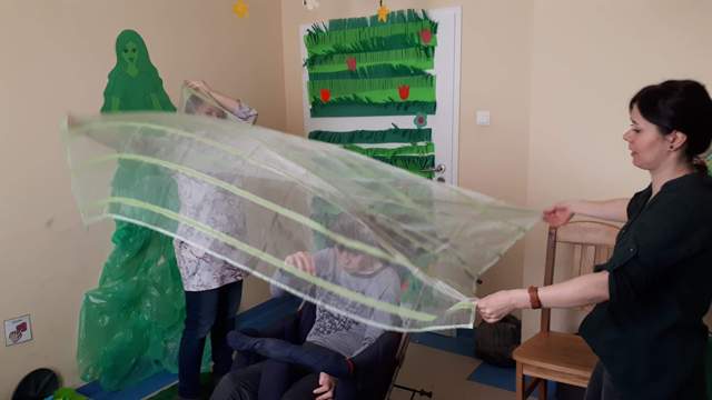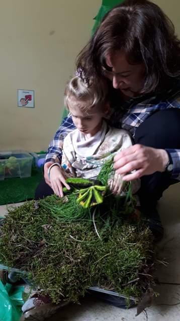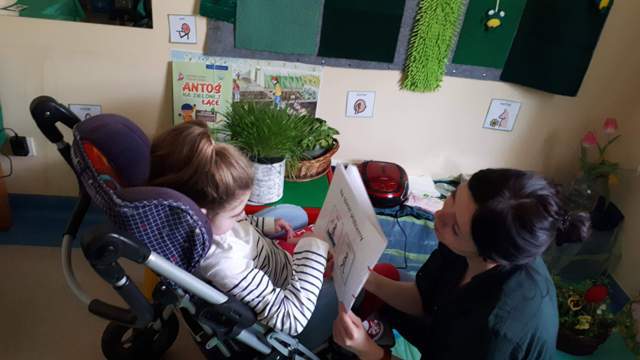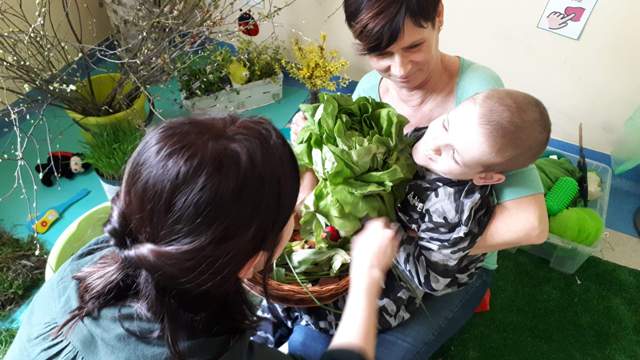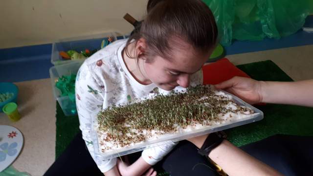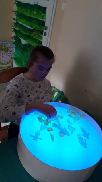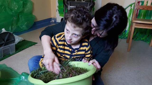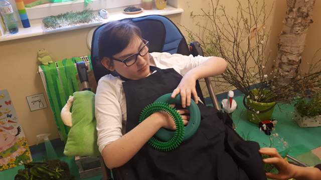 W marcu uczniowie nauczani indywidualnie w Ośrodku Wsparcia odwiedzali wiosenną salę sensoryczną. Zielono i pachnąco było już od progu - drzwi wejściowe zamieniły się w zielony trawnik, zapach młodych roślin wypełnił całą salę a pod sufitem falowały kwiaty i fruwały motyle. Gra świateł i naturalnego słońca podkreślała radosny nastrój tej pory roku. W świetlnej misie odwiedzający salę szukali koloru zielonego, wśród mchu kamieni fluorescencyjnych i zmieniających kolory podświetlanych jajek. Uczniowie zanurzali dłonie w ziemi, sadzili cebulę, poznawali zapach młodej trawy, szczypiorku i kwiatów. Podziwiali pąki i młode listki, a nawet kwiatki na gałązkach różnych krzewów. Mogli dotykać zielone przedmioty o różnych fakturach, słuchać odgłosów wiosennej przyrody, bocianów i żab. Wielozmysłowo poznawali wiosenne warzywa – rzodkiewkę, sałatę, rzeżuchę, szczypiorek. Nad wszystkim czuwała pani Wiosna w pięknej, strojnej i zielonej oczywiście sukience!