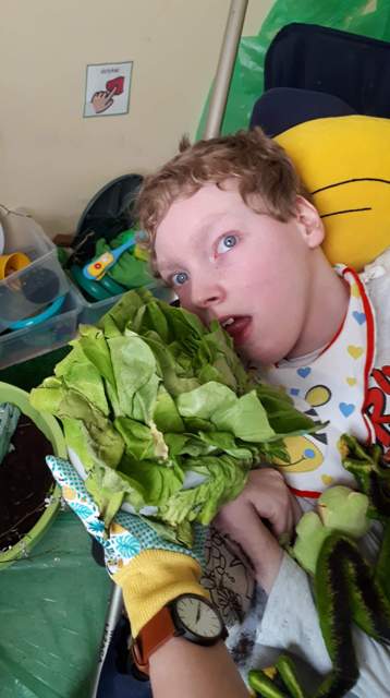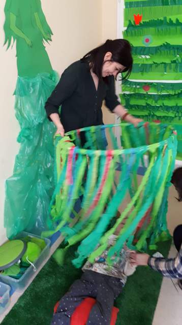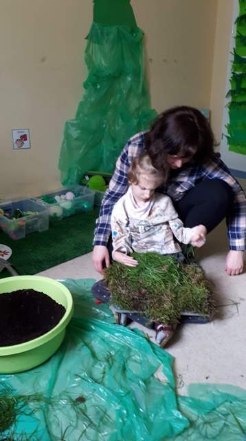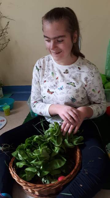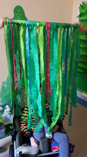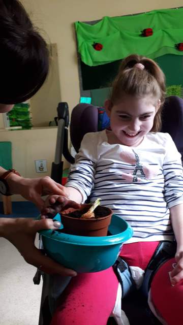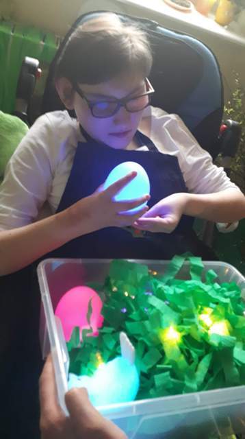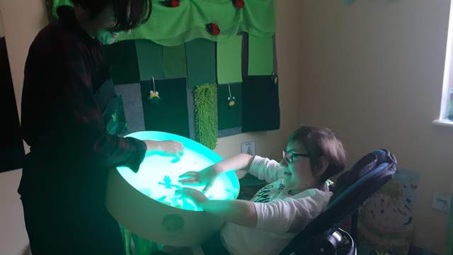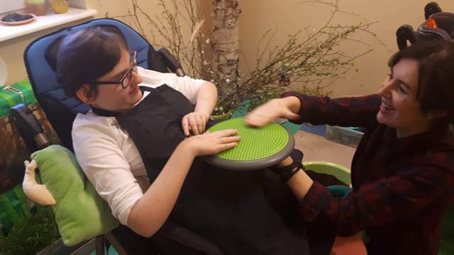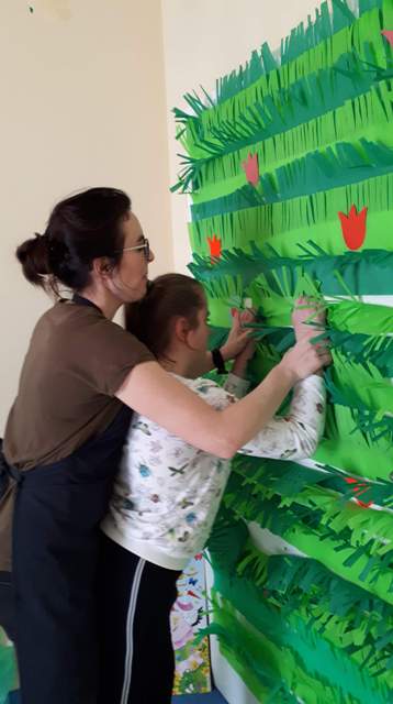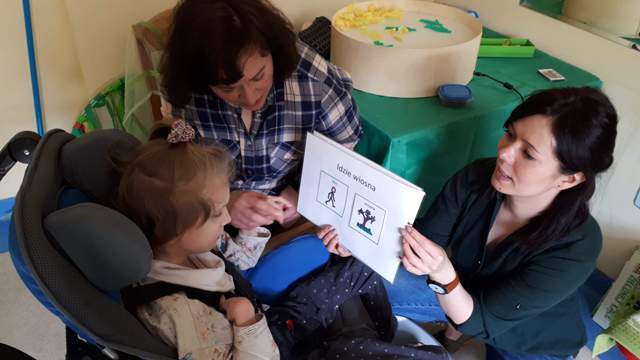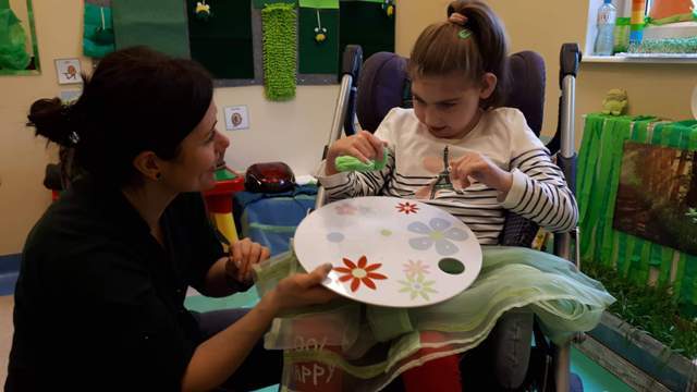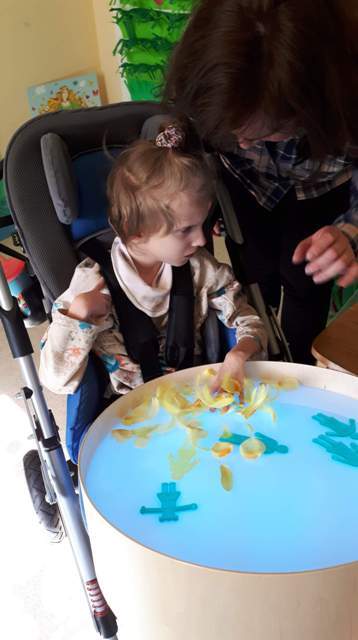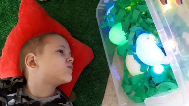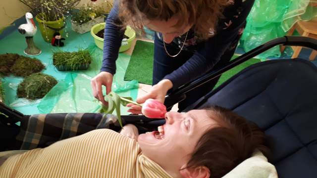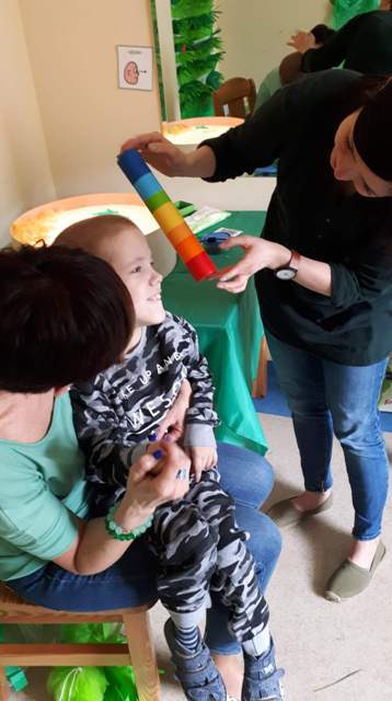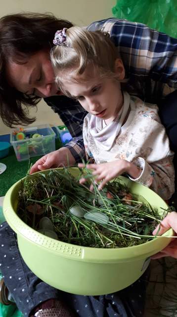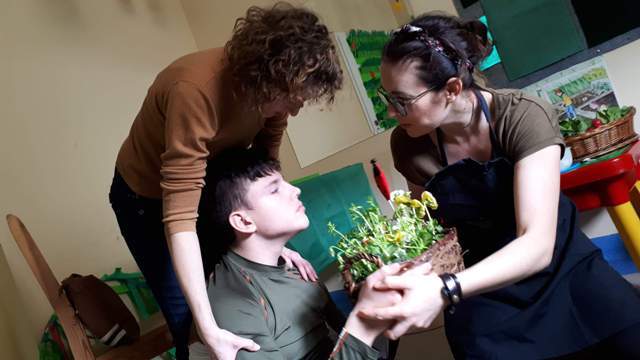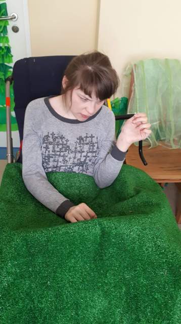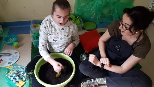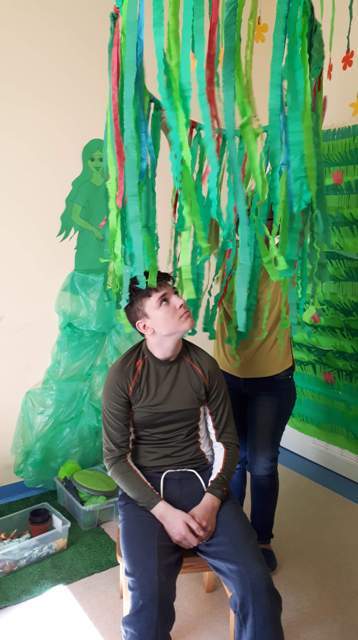 W marcu uczniowie nauczani indywidualnie w Ośrodku Wsparcia odwiedzali wiosenną salę sensoryczną. Zielono i pachnąco było już od progu - drzwi wejściowe zamieniły się w zielony trawnik, zapach młodych roślin wypełnił całą salę a pod sufitem falowały kwiaty i fruwały motyle. Gra świateł i naturalnego słońca podkreślała radosny nastrój tej pory roku. W świetlnej misie odwiedzający salę szukali koloru zielonego, wśród mchu kamieni fluorescencyjnych i zmieniających kolory podświetlanych jajek. Uczniowie zanurzali dłonie w ziemi, sadzili cebulę, poznawali zapach młodej trawy, szczypiorku i kwiatów. Podziwiali pąki i młode listki, a nawet kwiatki na gałązkach różnych krzewów. Mogli dotykać zielone przedmioty o różnych fakturach, słuchać odgłosów wiosennej przyrody, bocianów i żab. Wielozmysłowo poznawali wiosenne warzywa – rzodkiewkę, sałatę, rzeżuchę, szczypiorek. Nad wszystkim czuwała pani Wiosna w pięknej, strojnej i zielonej oczywiście sukience!