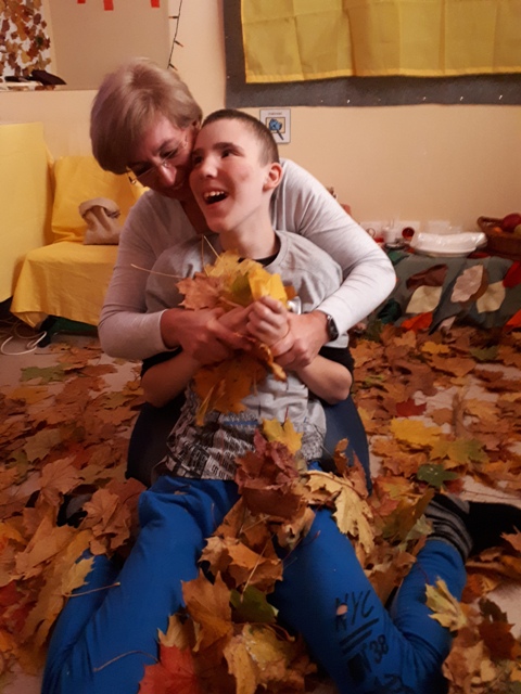 Przyszła jesień, a z nią rozpoczął się cykl zajęć Sensoryczne Pory Roku dla dzieci i młodzieży nauczanej indywidualnie. Zajęcia mają na celu rozwijanie wrażliwości sensorycznej naszych uczniów. Sala w Ośrodku Wsparcia zamieniła się w jesienny park i ogród jednocześnie. Dookoła było mnóstwo kolorowych liści, po których spacerowali uczniowie. Co niektórzy mieli nawet chęć zanurzenia się w nich i... zrobili to! Każdy uczeń - indywidualnie, w swoim tempie, mógł poczuć polisensorycznie wszechogarniającą jesień. Nie zabrakło naturalnych darów jesieni: pudła pełne kasztanów, żołędzi, szyszek i mchu, było świetną okazją do rozwijania zmysłu dotyku, jak również słuchu. Mieszanie, przesypywanie, wyrzucanie sprawiało ogromną przyjemność naszym uczniom. Aby przybliżyć kolorystykę jesieni, pod sufitem wirowały czerwone, zielone, żółte i pomarańczowe krepy. Słuchaliśmy różnych dźwięków przyrody: powiewu wiatru, szumu drzew, padającego deszczu. Uczniowie już wiedzą, gdy za oknem chlapa zakładamy pelerynę i kalosze. Jesień nie będzie kojarzyła się nam tylko z zapachem lawendy. To może to być mokra gleba, czy włoski orzech. Na koniec dla naszych uczniów przygotowaliśmy coś dobrego… smakowanie jesiennych owoców i przetworów. Mniam…